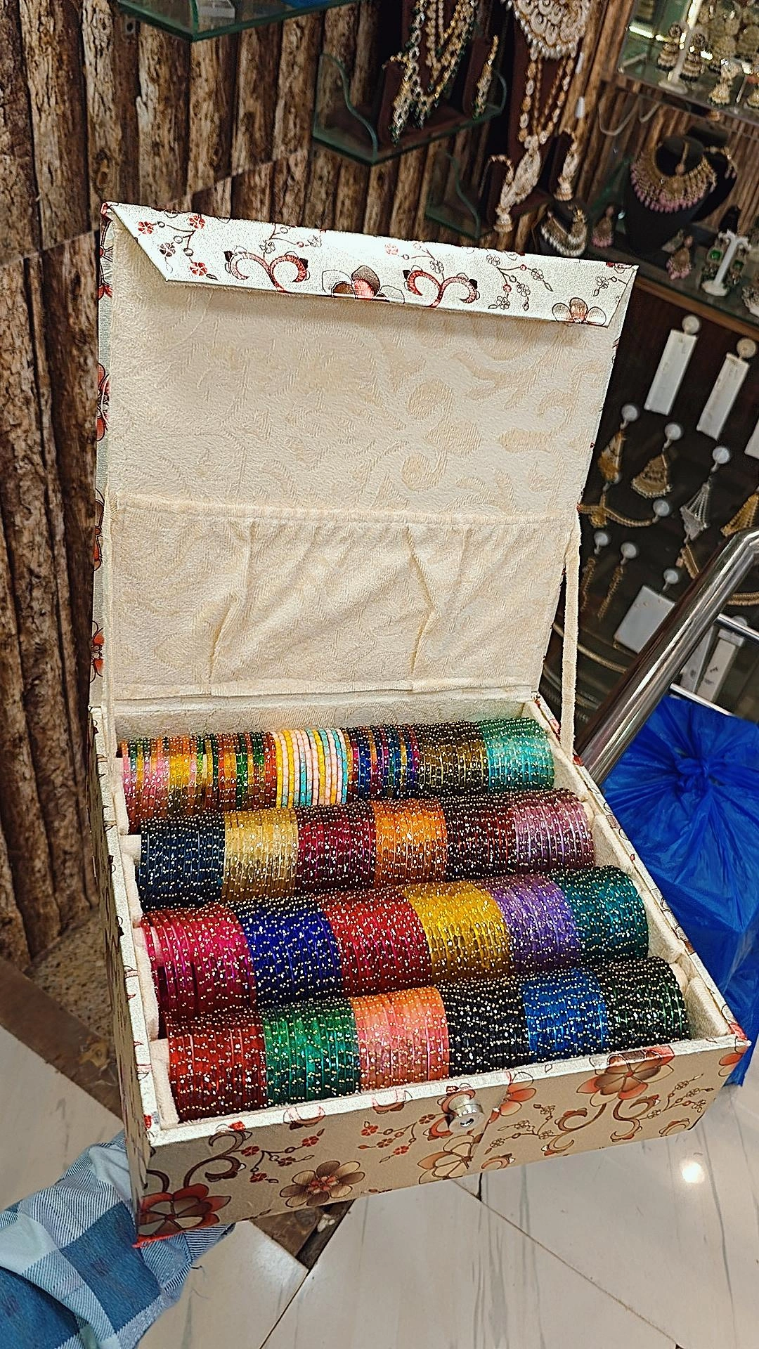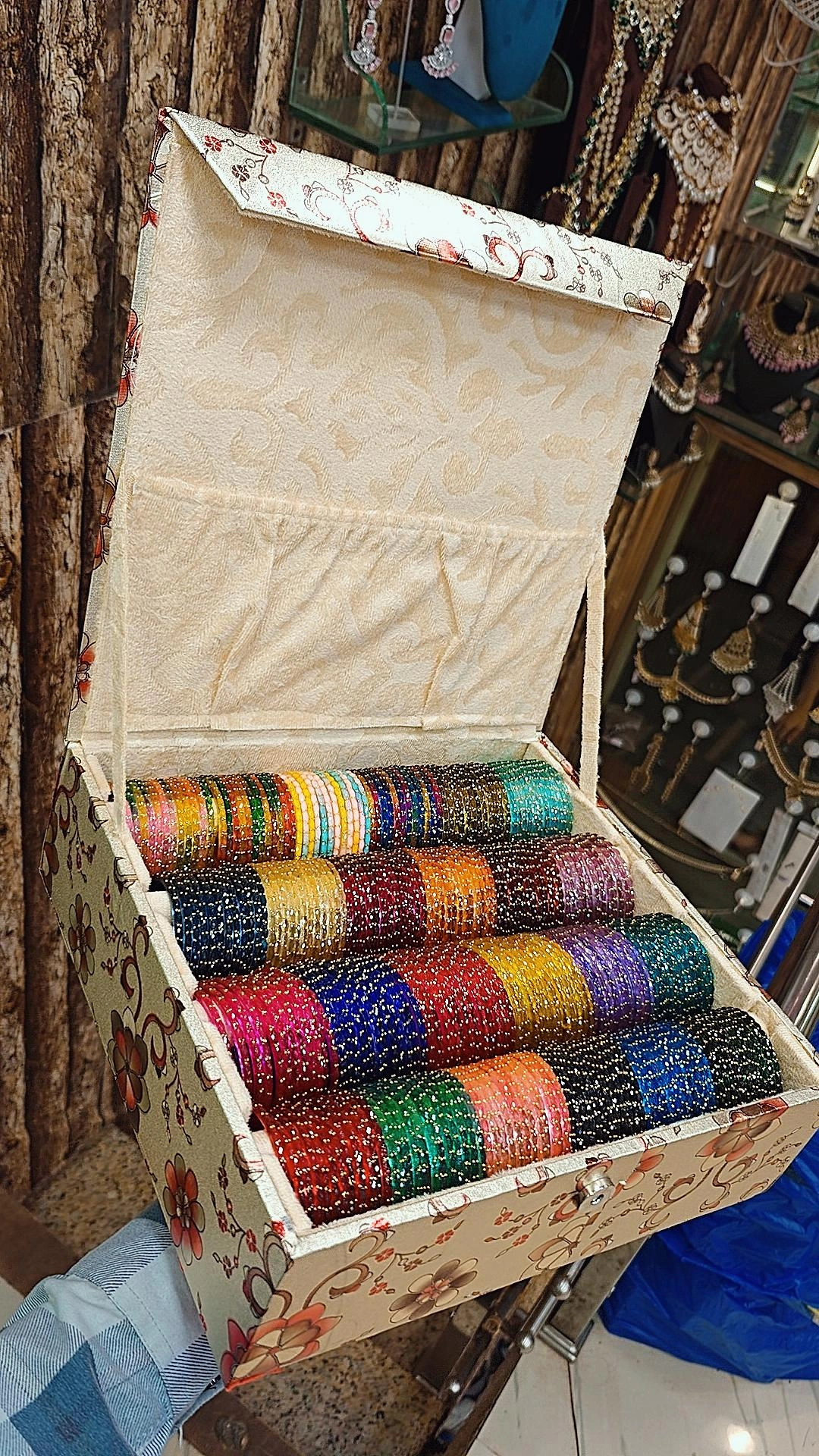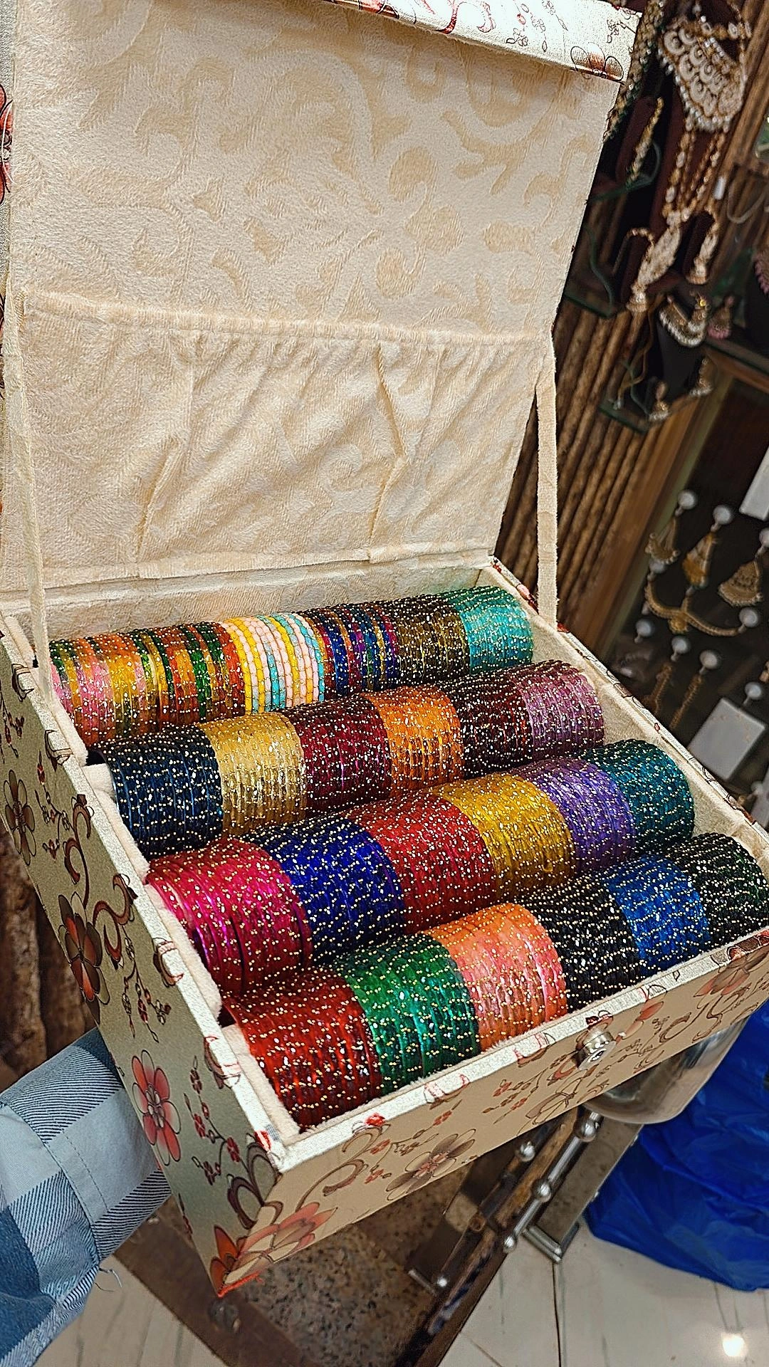 A BEAUTIFUL GOLD DROP GLASS BANGLES WITH 25 DOZEN 25 COLOURS COMBO BOX WITH BEAUTIFUL FLOWER 🌹 PRINT BANGLES BOX AVAILABLE IN ALL SIZE WITH RICHNESS LOOK ..EACH COLOURS TAKE 12 BANGLES..