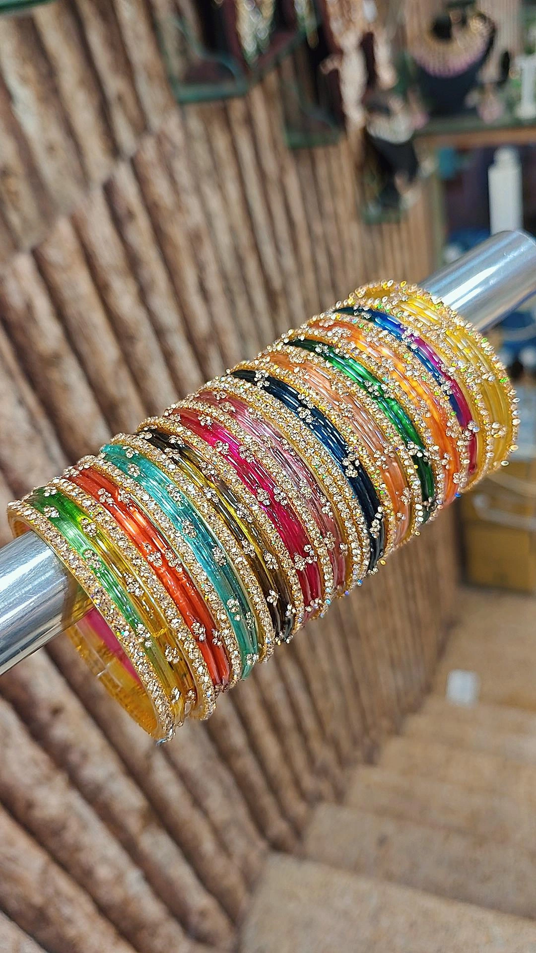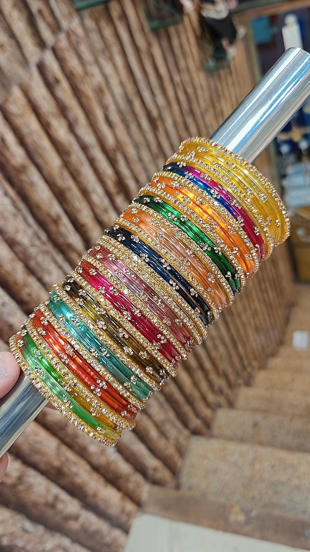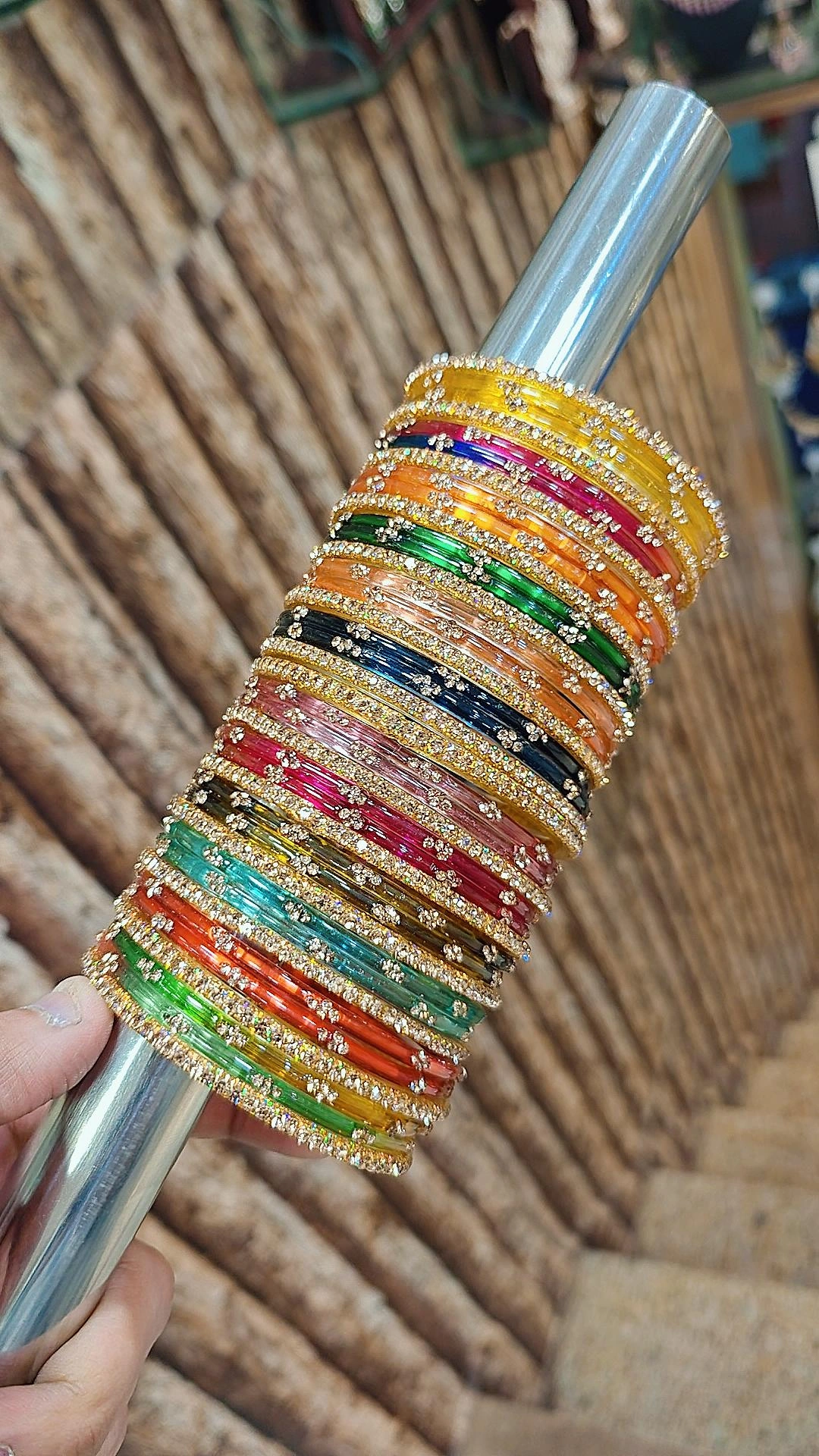 A BEAUTIFUL FIRANGI GLOSSY GLASS STONE BANGLES SET WITH BEAUTIFULL GOLDEN STONE BANGLES LOOK WITH COLOUR FULL BANGLES FOR TWO HAND SET AVAILABLE IN ALL SIZE WITH BEST QUALITY AND TRENDING LOOK