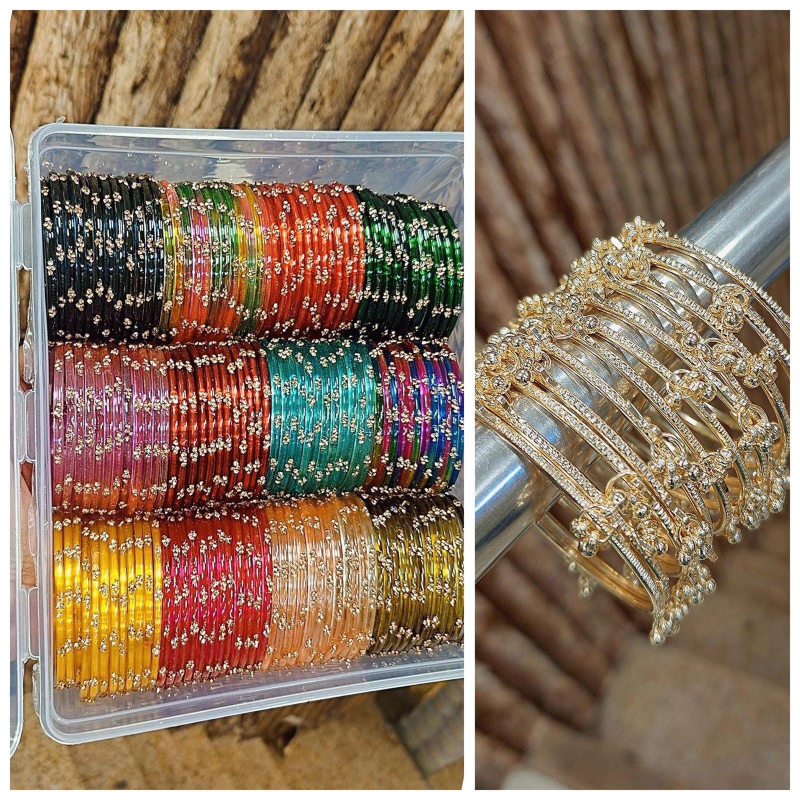 A BEAUTIFUL ❤️ COMBO BOX OF GLOSSY GLASS STONE BANGLES WITH KASMIRI GHUNGRU BANGLES AVAILABLE IN ALL SIZE WITH BEAUTIFUL LOOK AND U CAN MAKE YOUR OWN MATCHING BANGLES SET WITH THIS GLOSSY GLASS STONE BANGLES 12 COLOURS 12 DOZEN WITH 12 PCS OF KASMIRI GHUNGRU BANGLES