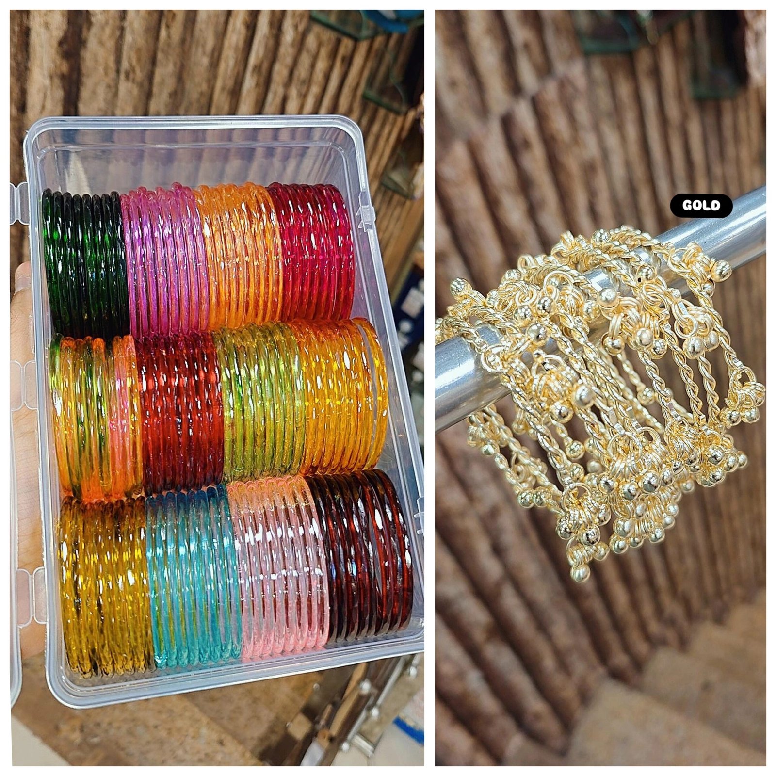 A beautiful glossy glass bangles with Kasmiri gold ghunghroo bangles with best and richness look for wedding occasion make your own mathching bangles set with this beautiful combo box 12 set of glossy glass bangles with 8 PCS GHUNGRU BANGLES ❤️