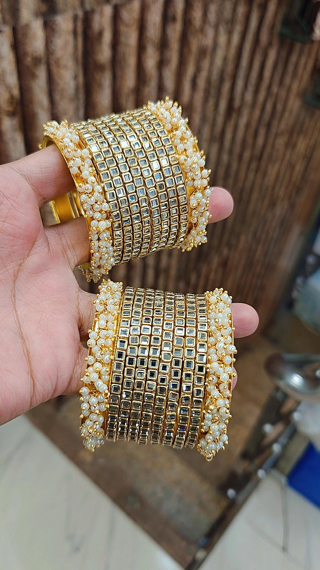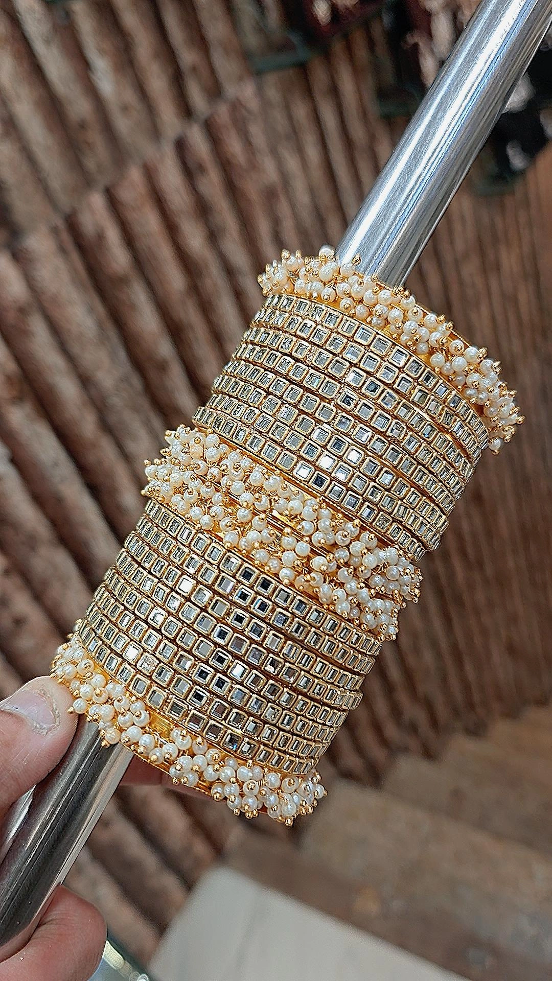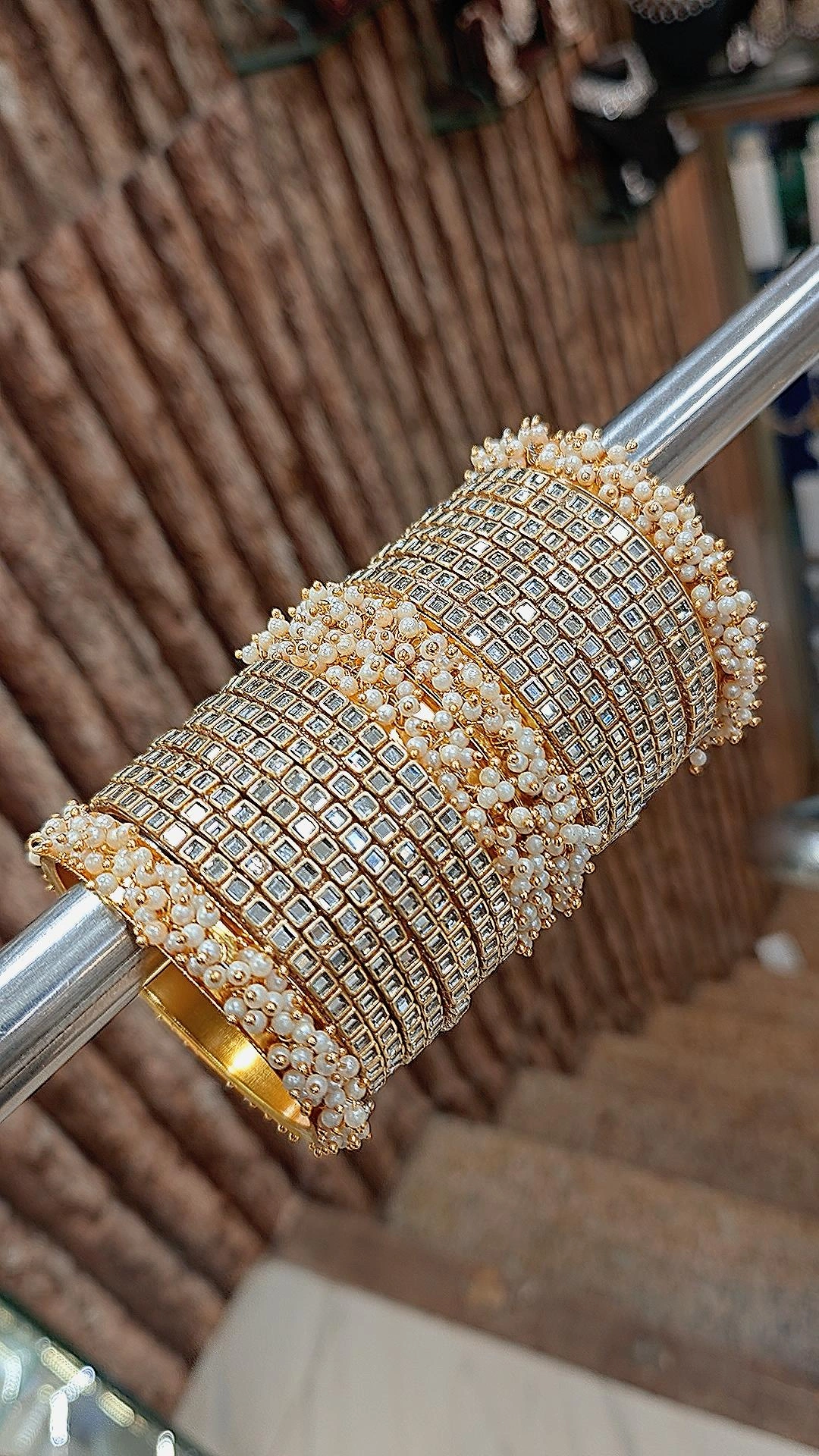 KUNDAN LARIYA MOTI SET WITH 24 PCS KUNDAN BANGLES AND 4 PCS LARIYA MOTI KADA ❤️ TWO HAND SET WHICH WE SHOW IN PICS AVAILABLE IN ALL SIZES WITH SAME LOOK