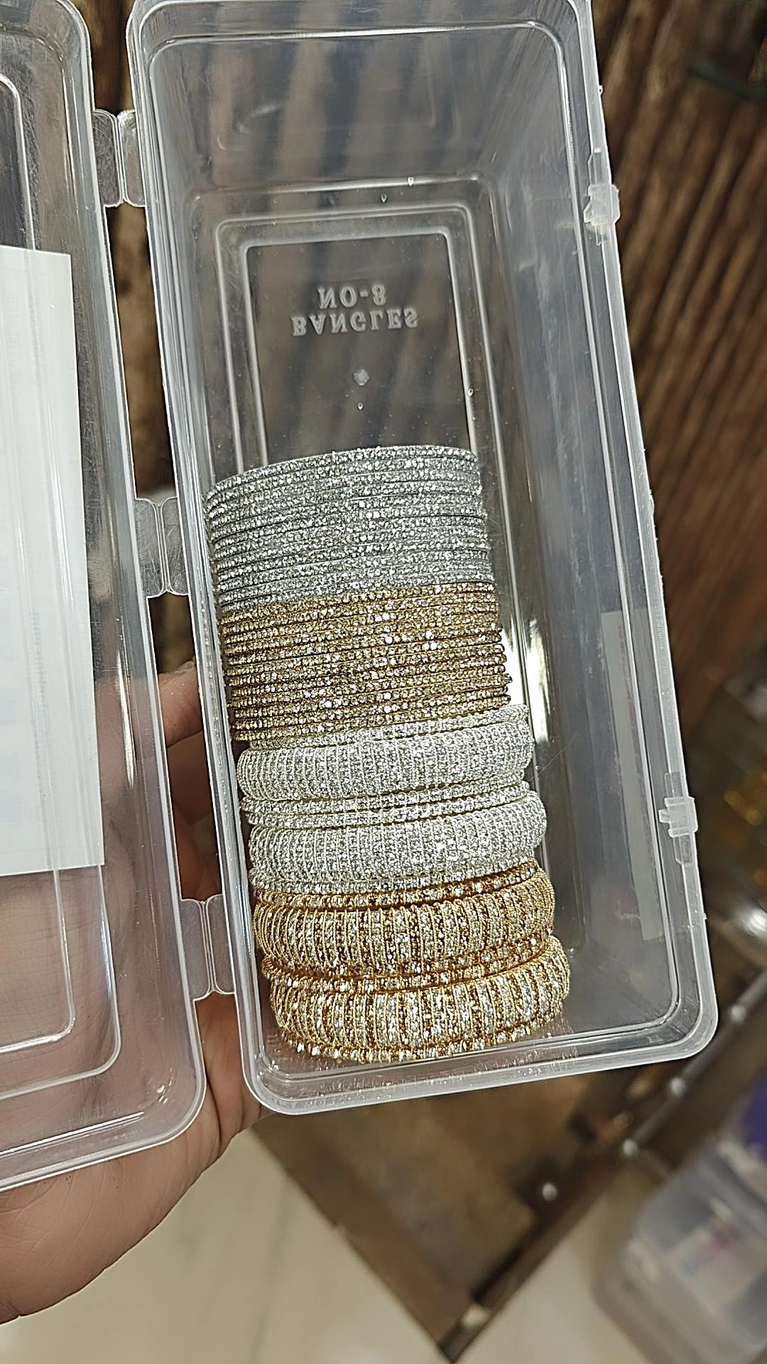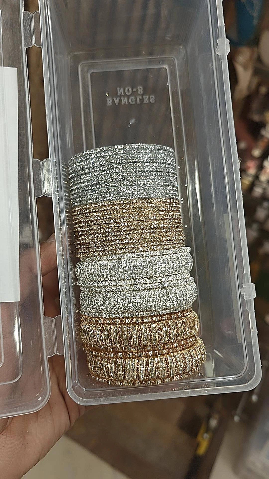 LOVE STONE COMBO BOX WITH 4 DIFFERENT TYPE OF SIDE BANGLES WITH BEAUTIFUL QUALITY OF 12 PCS GOLD STONE BANGLES 12 PCS SILVER STONE BANGLES 6 PCS GOLDEN STONE SET 6 PCS SILVER STONE SET..MAKE YOUR OWN MATCHING BANGLES SET WITH THIS COMBO BOX