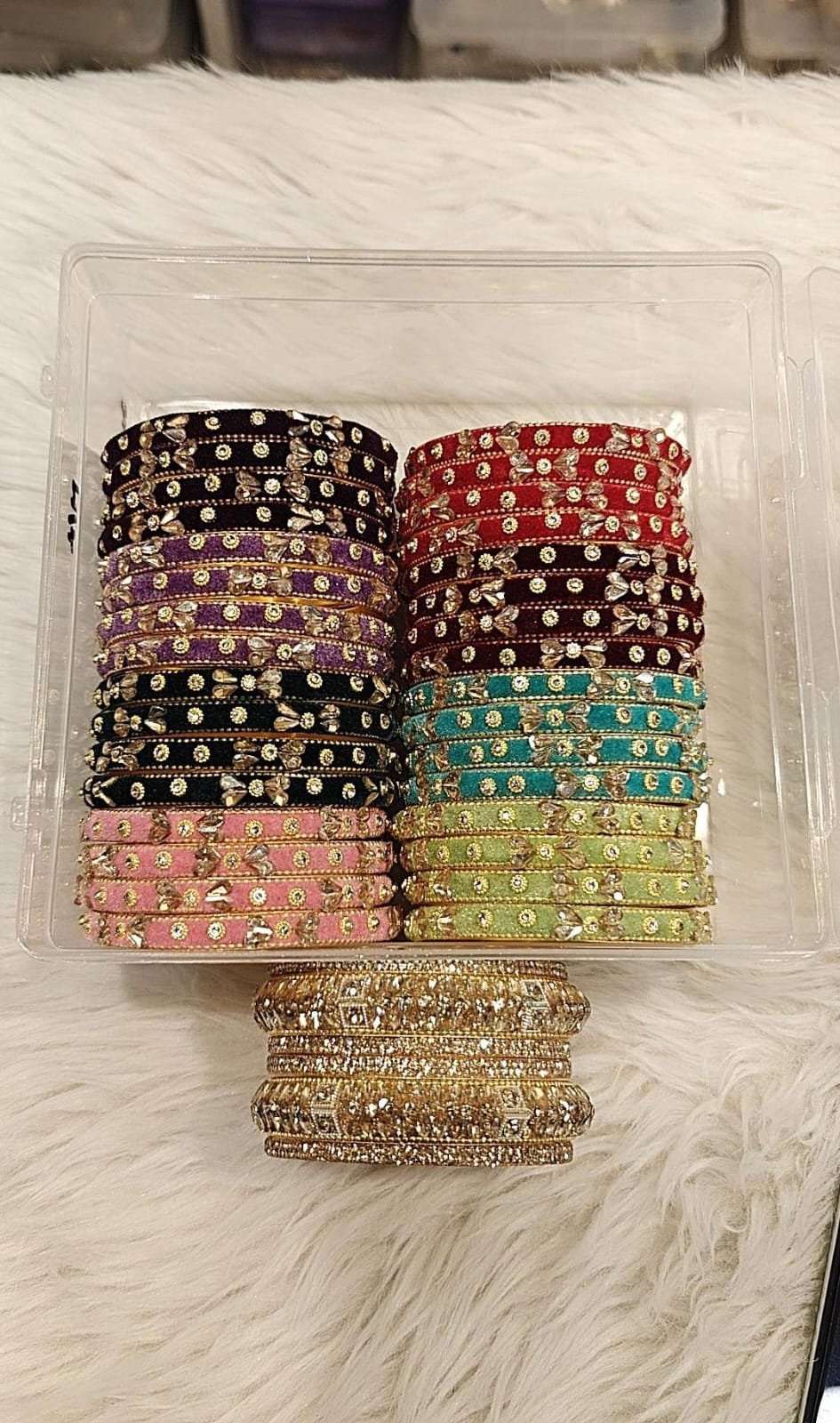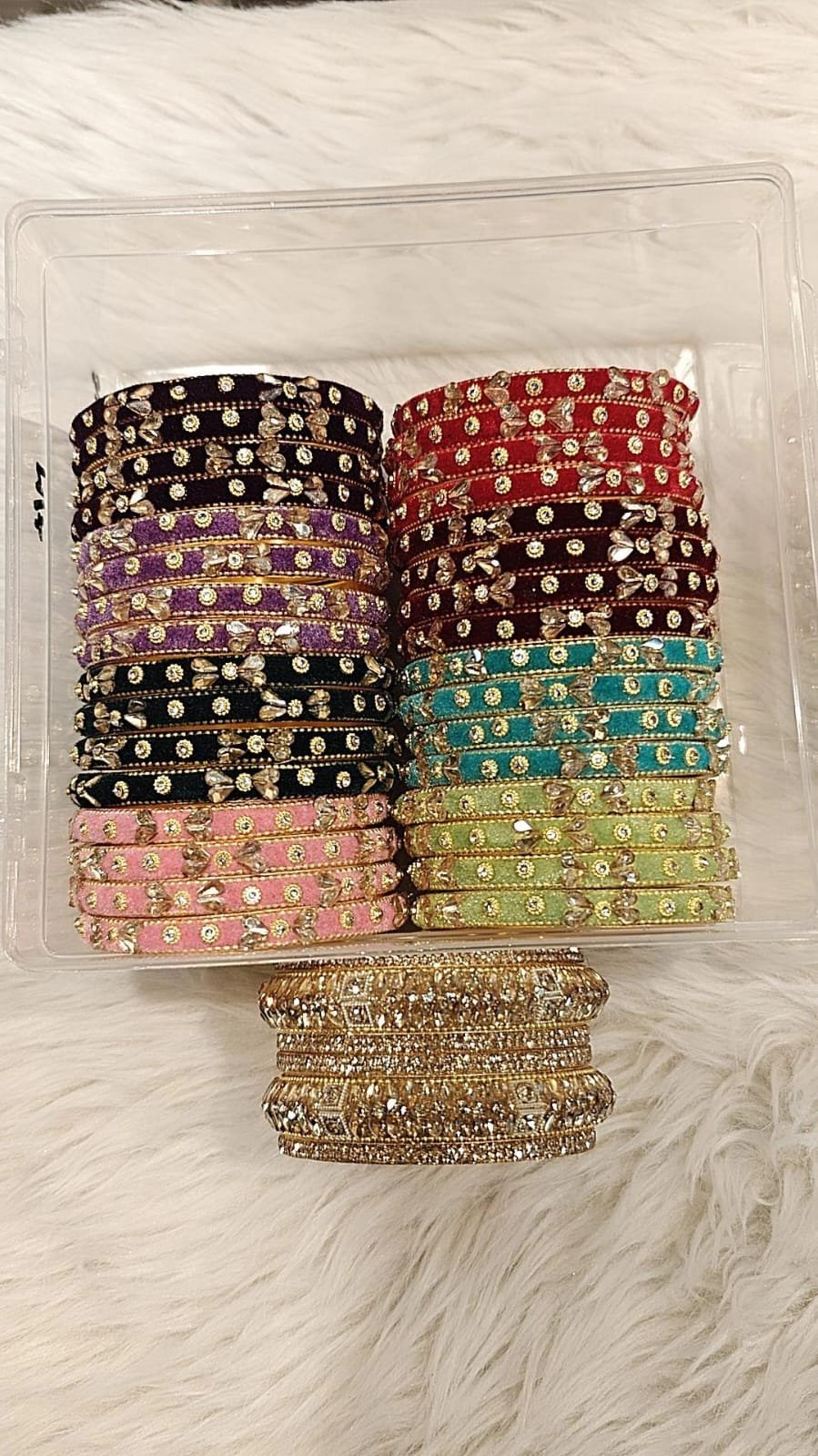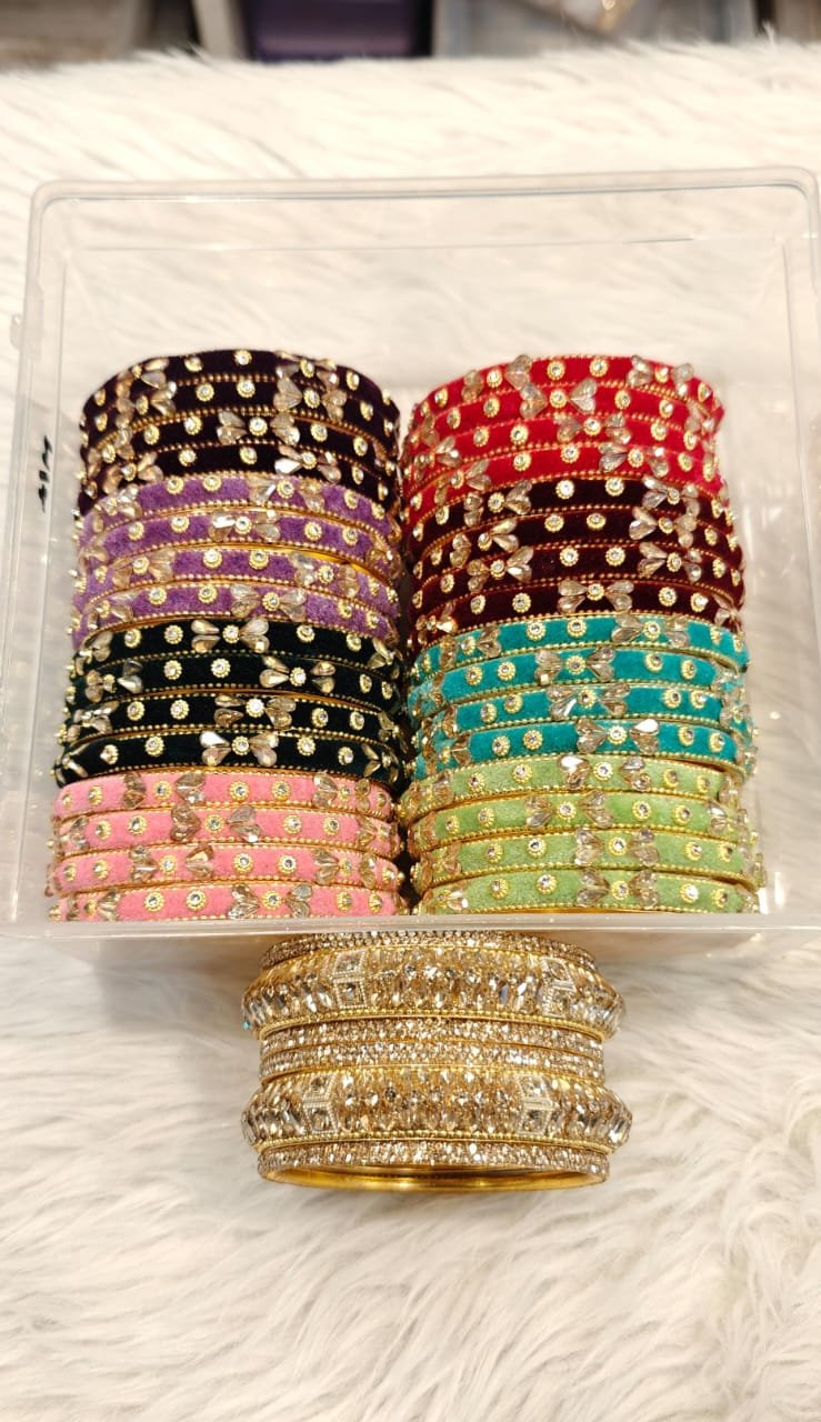 A BEAUTIFUL COMBO OF VELVET METAL STONE BANGLES WITH 6 PCS GOLDEN STONE BANGLES …