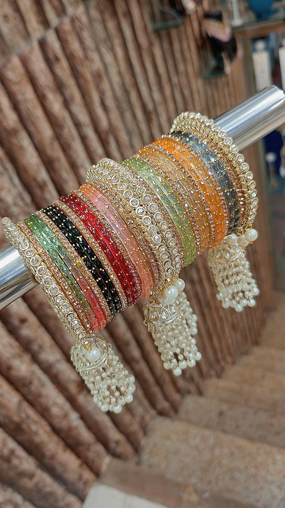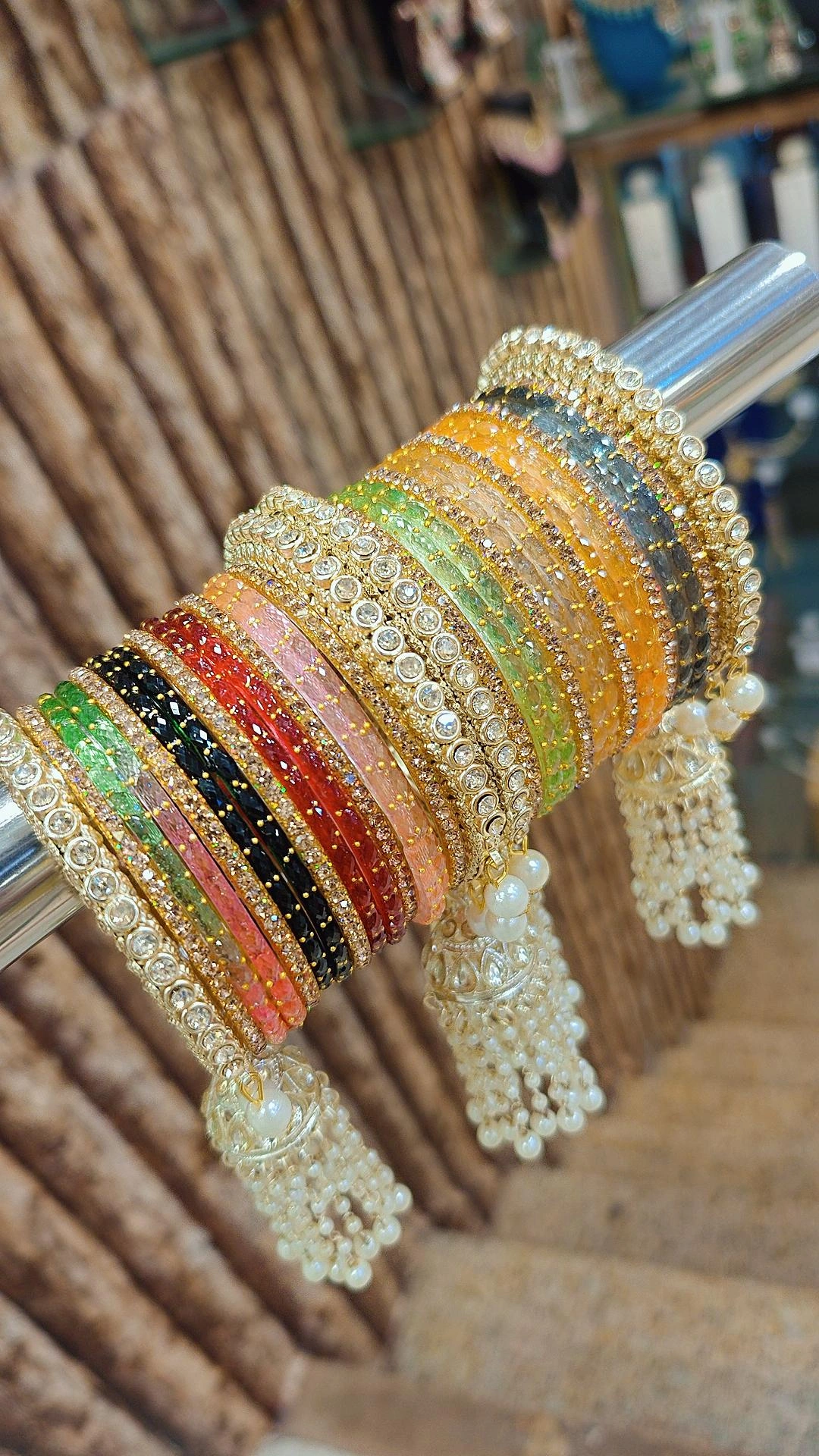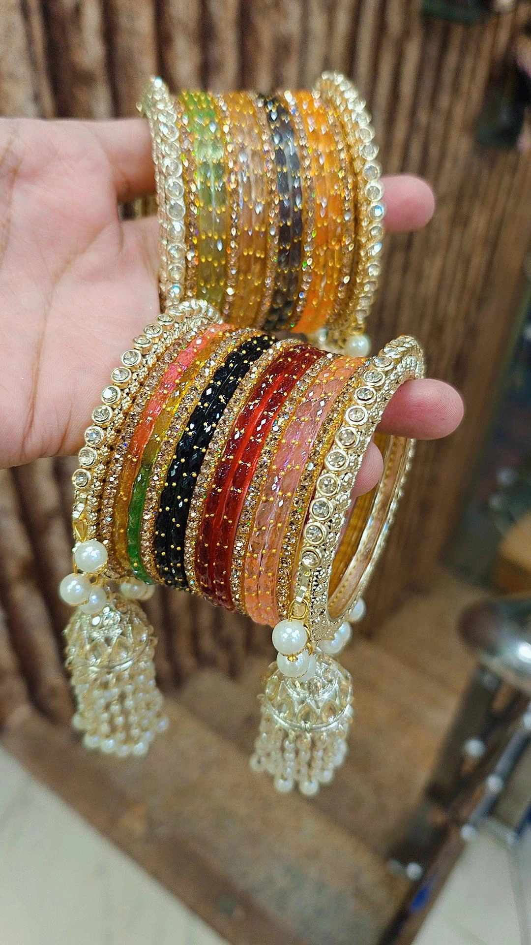 A BEAUTIFUL MULTI JHUMRI GLASS BANGLES SET WITH BEAUTIFUL 2 HAND SET OF MULTI GLASS BANGLES WITH 4 PCS JHUMRI BANGLES WITH GOLD SHADOW STONE TOUCH LOOK AVAILABLE IN ALL SIZE WITH BEST IN QUALITY