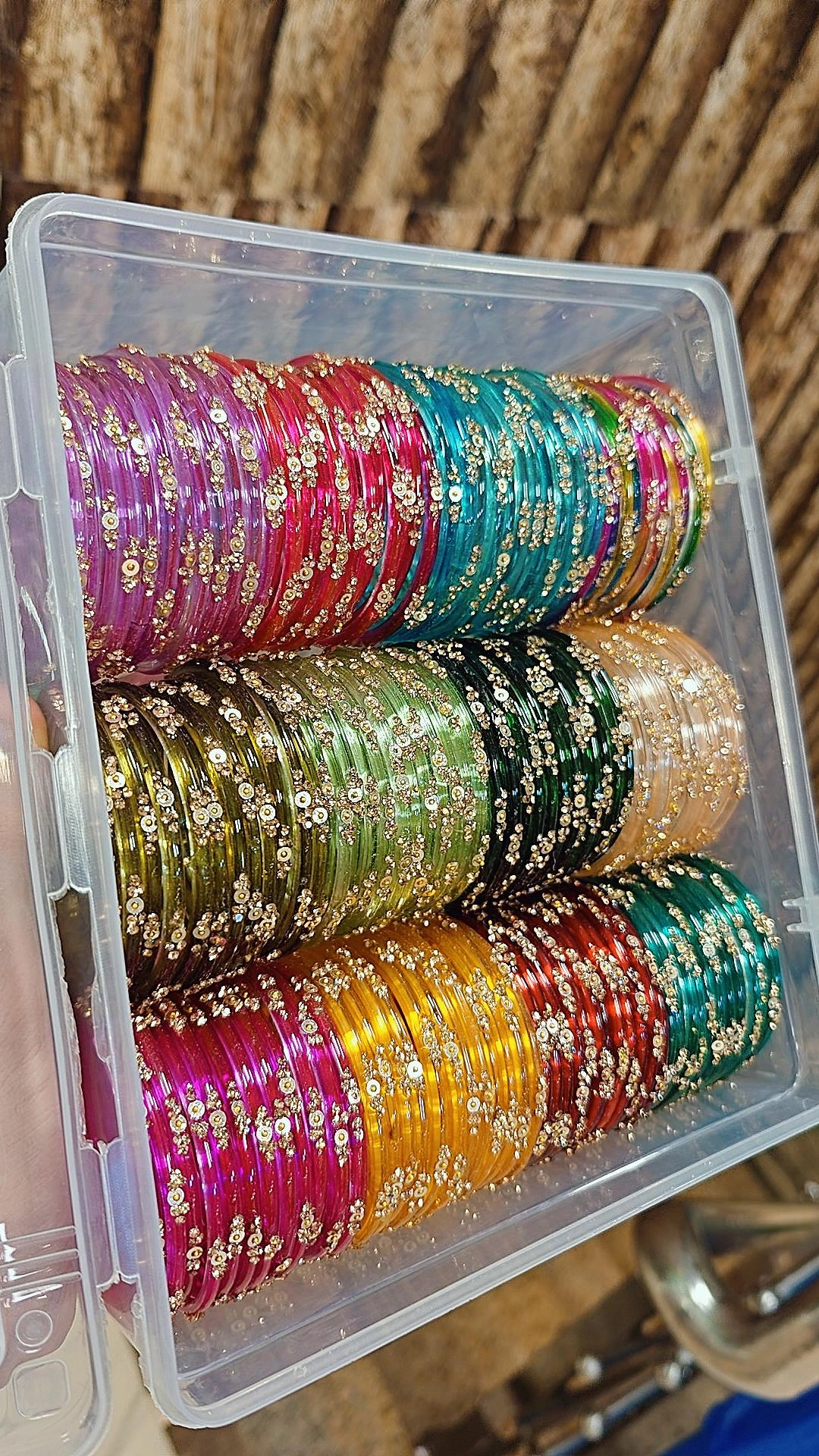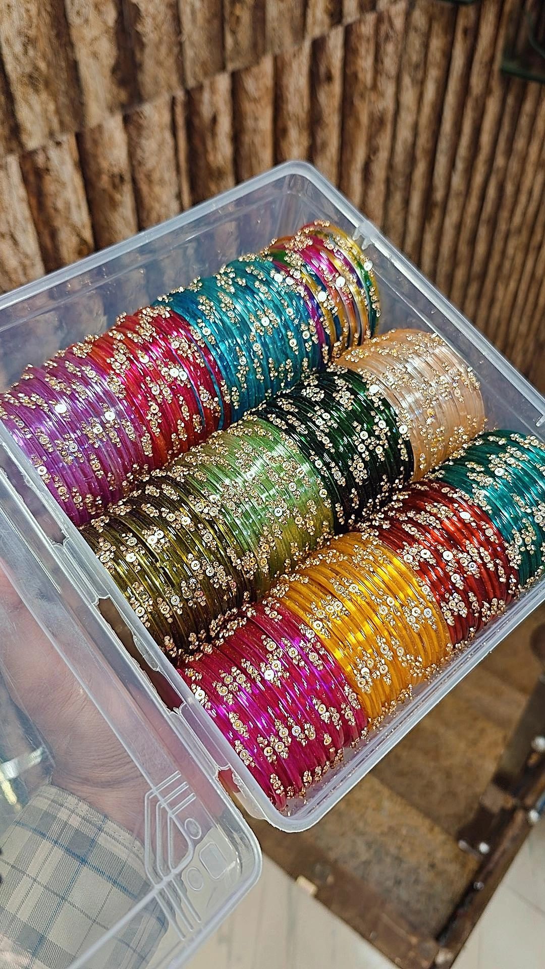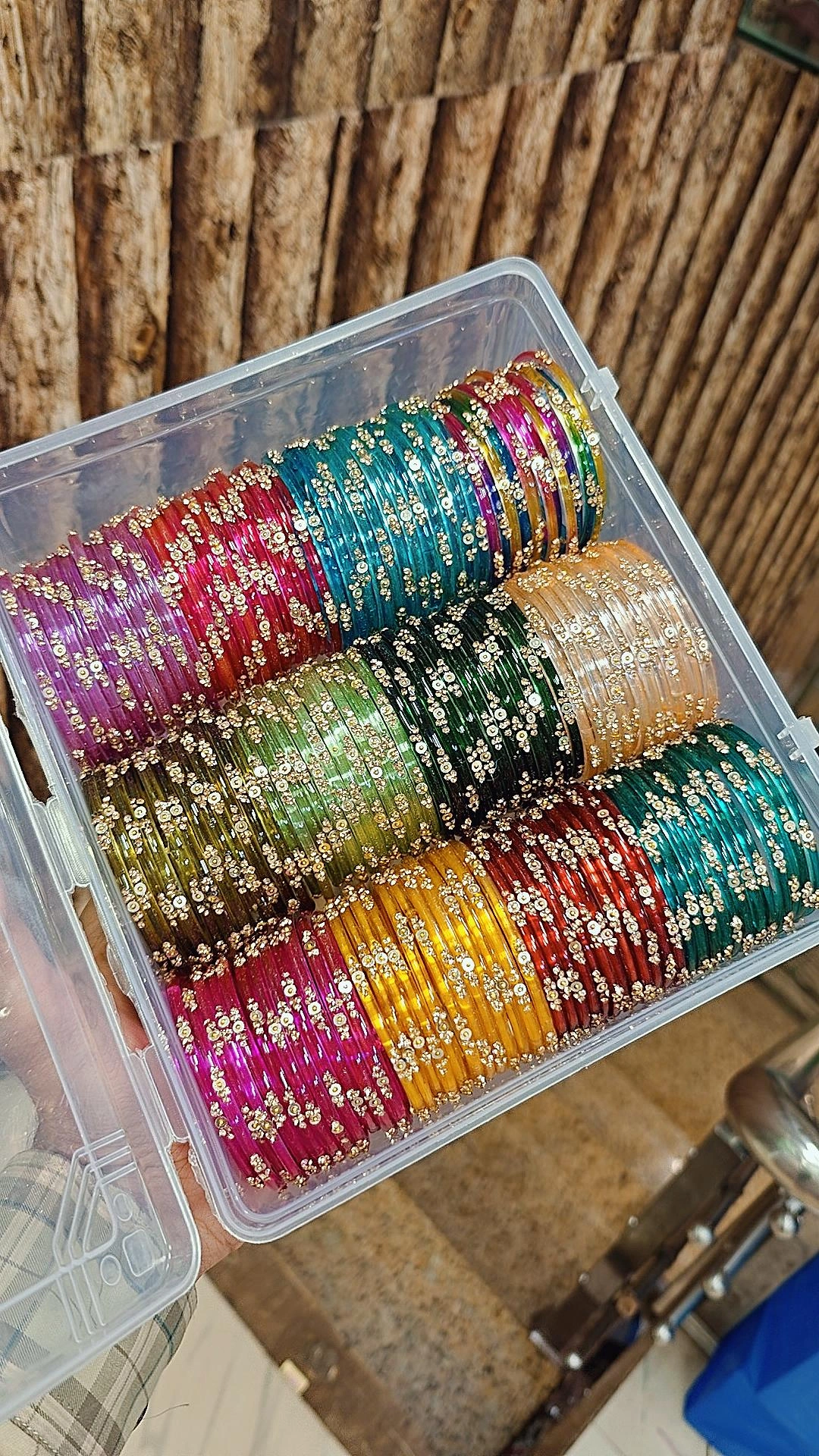 A BEAUTIFUL TIKKI JELLY GLASS STONE BANGLES WITH BEAUTIFUL 12 COLOURS 12 DOZEN COMBO BOX WITH BEAUTIFUL QUALITY OF GLASS BANGLES ❤️ AND BEST PACKING WITH TRENDING AND VIRAL
