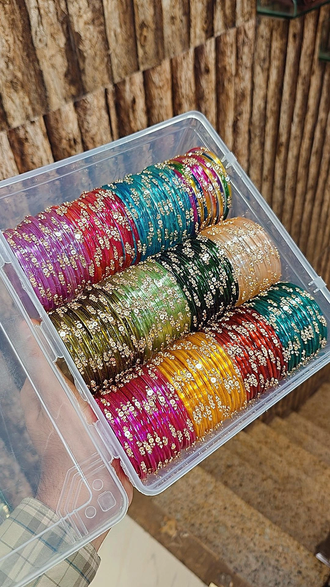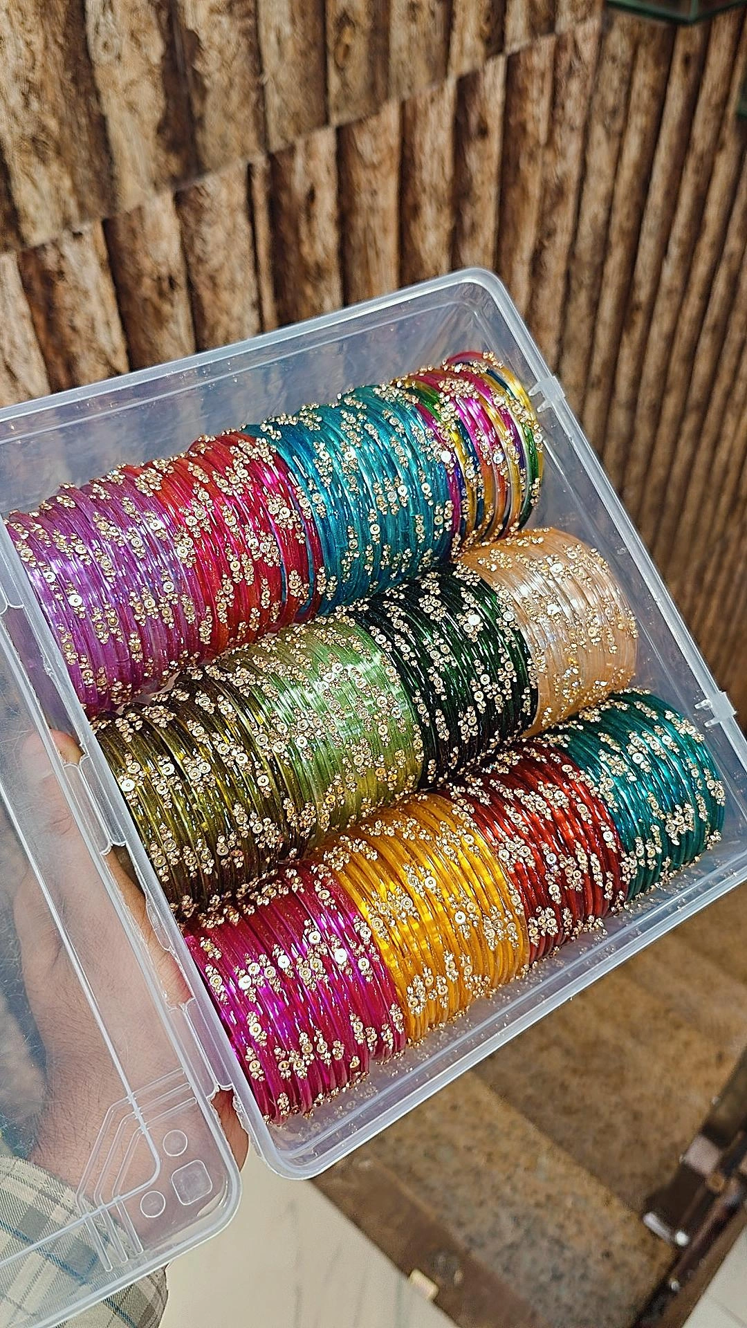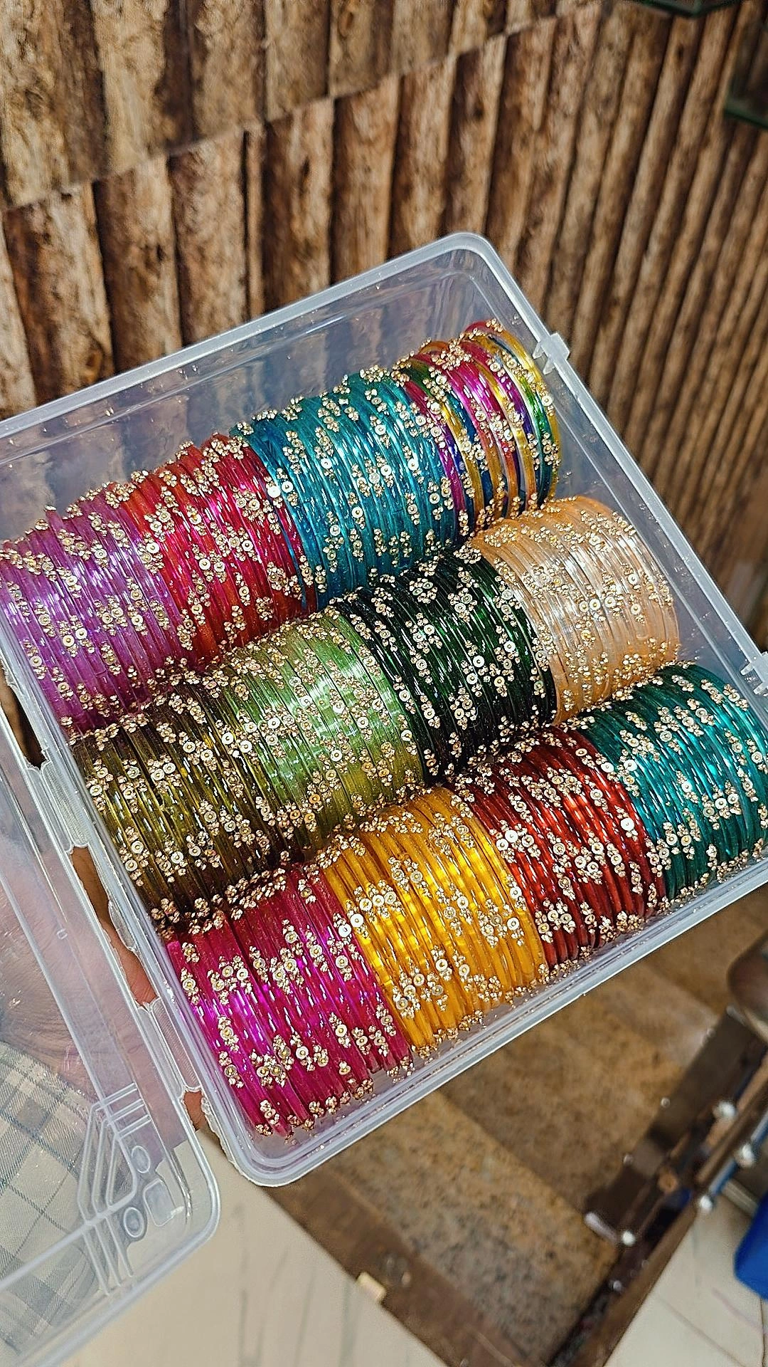 A BEAUTIFUL TIKKI JELLY GLASS STONE BANGLES WITH BEAUTIFUL 12 COLOURS 12 DOZEN COMBO BOX WITH BEAUTIFUL QUALITY OF GLASS BANGLES ❤️ AND BEST PACKING WITH TRENDING AND VIRAL