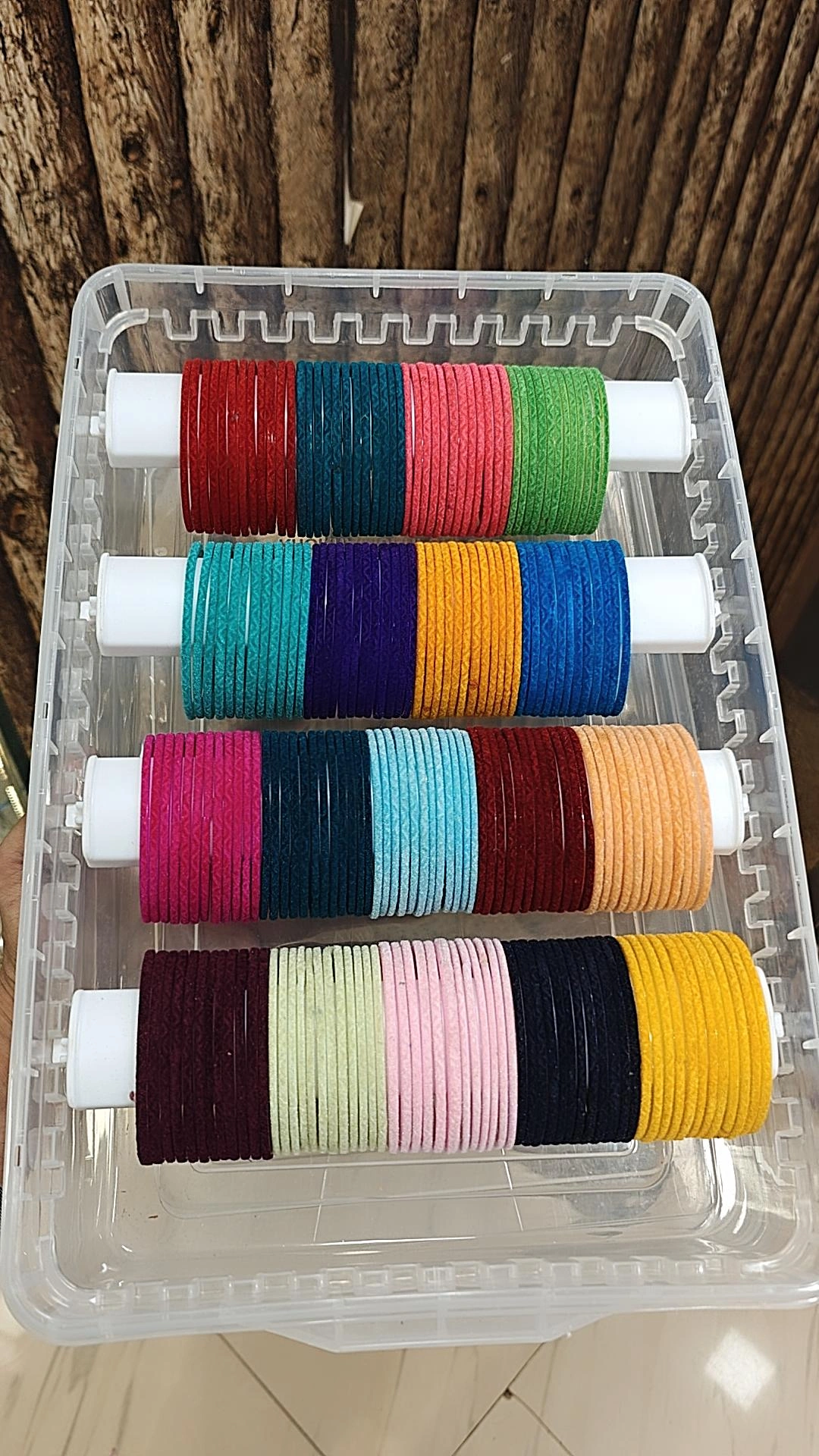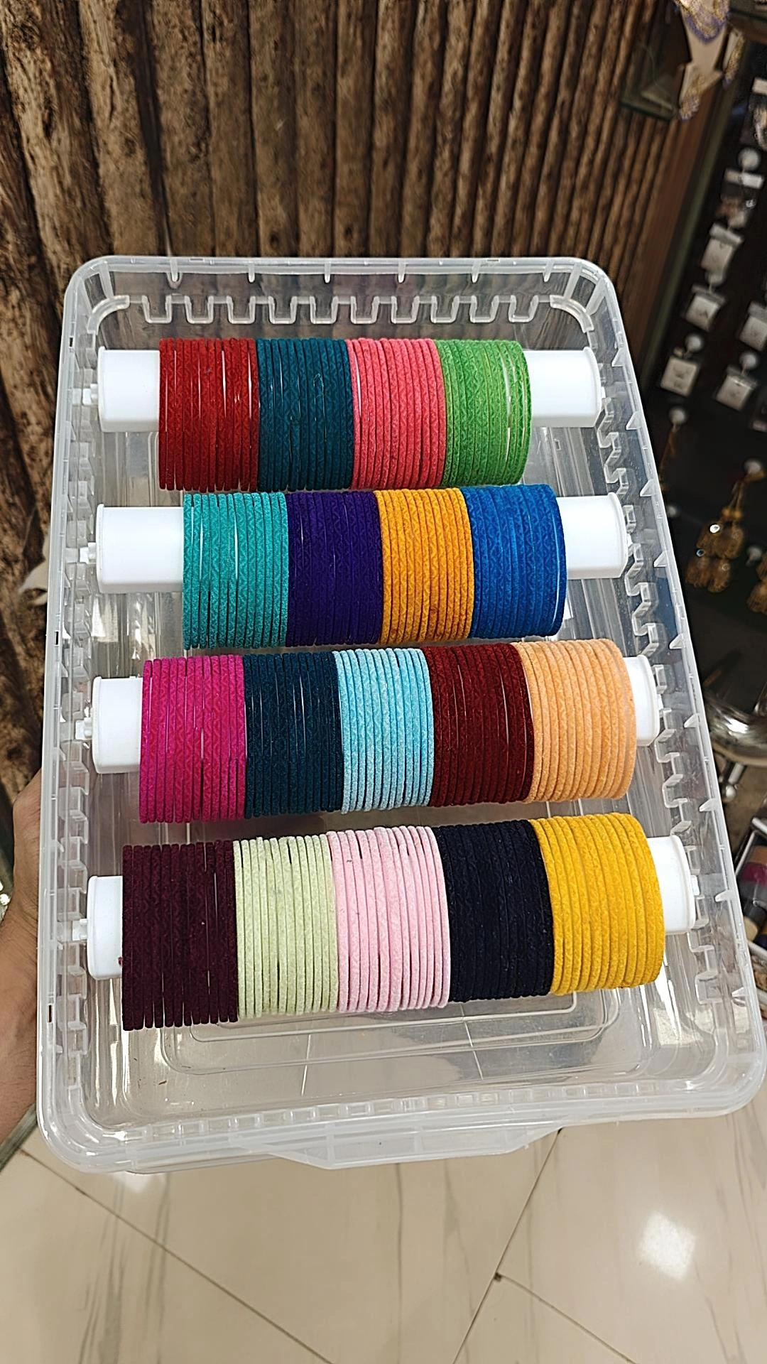 FINALLY WE LAUNCHED OUR MOST WAITED VELVET GLASS BANGLES WITH 18 DOZEN 18 COLOURS COMBO BOX WITH 4 ROLL PLASTIC STORAGE BOX ..EACH COLOURS TAKE 12 BANGLES ..AND ALL COLOURS IS DIFFERENT IN BOXES…BEST IN QUALITY AND GLASS BANGLES